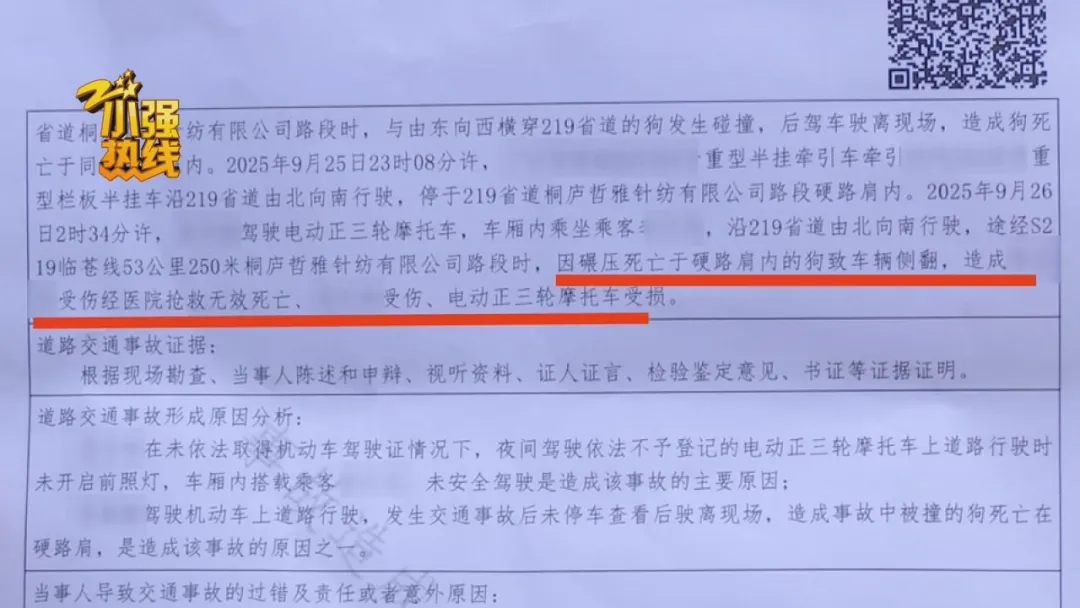 当天凌晨2点,有人骑着电动三轮车碾压到了躺在硬路肩内的狗尸体,车辆侧翻,造成乘坐车辆的一位71岁老太太身亡。事故发生后,狗无人认领,李先生的车子被扣。