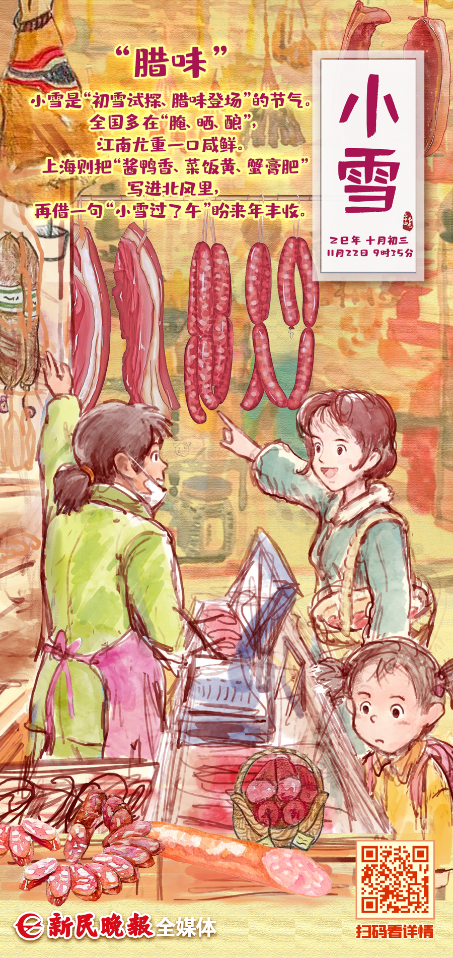 今天迎来“小雪”节气,这是“初雪试探、腊味登场”的时节,全国都在“腌、晒、酿”,江南尤重一口咸鲜;上海则把“酱鸭香、菜饭黄、蟹膏肥”写进北风里。