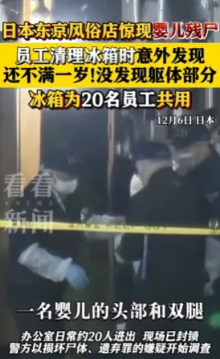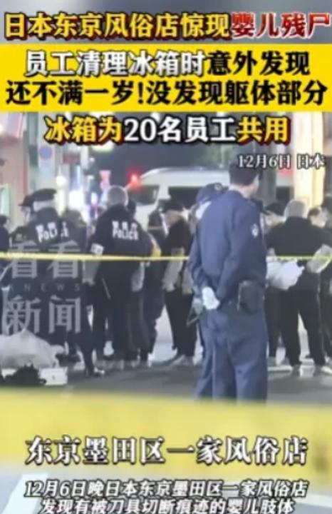 12月6日,日本东京墨田区一家风俗店的办公室冰箱内,发现了刚出生不久的婴儿头部及四肢,躯体则下落不明。